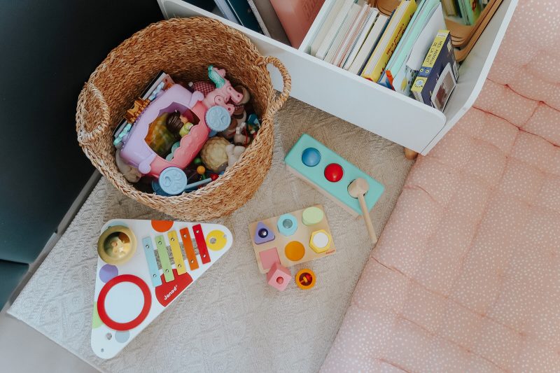Tapis Toddlekind / Panier pompons – Les enfants du design / Panier à roulettes – Petit sixième / Gros nounours – Auchan / Phaon à roulette – Judy the fox / Chaise – La redoute / Bibliothèque – Vertbaudet